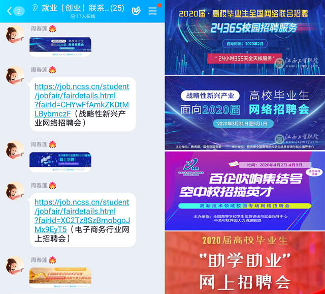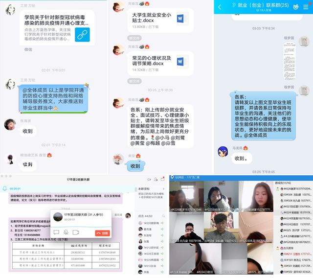疫情防控期间,学院审时度势,积极响应省厅要求,调整就业工作思路,灵活利用网络工具,暂停线下活动,适应新变化,推动“云就业”体系。一是“云招聘”。学院开通顶岗实习平台(dg.jxgmxy.com:8080),用人单位可实名注册,发布招聘信息,经就业处审核梳理后,通过顶岗实习移动门户、微就业平台、就业工作群、毕业生班级群等平台发送给毕业生。学院大力推广“江西微就业”,畅通就业信息,引导学生利用“江西微就业”/“职位智能匹配”中设置职位匹配意向,选择符合匹配度的就业信息。二是“云服务”。学院充分利用官方网站、微信公众号、就业系统等网络平台,通过发布《大道如砥前有路•乘风破浪踏歌行—江西工贸学院致全体2020届毕业生和广大用人单位的一封信》,及时将疫情防控期间国家就业政策和学院就业工作安排、最新动态进行告知,集结各方力量,坚定疫情防治和稳定就业信心。发挥辅导员家校沟通桥梁优势,通过家长微信群及时传达学院就业信息,开展每周线上班会和疫情防控就业心理健康主题班会,及时掌握毕业生思想、心理动态,帮学生准确解读和分析国家及地方政府的就业政策,疏导就业恐慌心理。三是“云咨询”。学院就业处联合各系部开通QQ在线咨询和电话热线咨询两种渠道,24小时在线为学生提供就业指导和心理咨询服务。四是“云帮扶”。学院针对“建档立卡”学生从大三顶岗实习开始到毕业后两年,采取一对一师生帮扶制度,全面了解其就业情况,提供就业指导。对于就业困难的同学,主动了解就业意向,提供就业信息和工作单位。(文/图 就业工作处)
