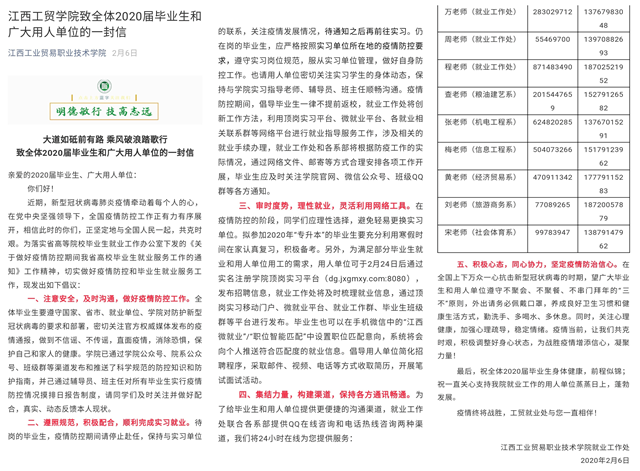 心中有担当、肩上有责任、行动有落实。一是提高政治站位。江西工贸职院高度重视疫情防控期间毕业生就业工作,深入分析当前疫情形势对就业工作的正反影响,吃透用好国家和地方政策红利,转危为机,化压力为动力,不断坚定信心,迎难而上。二是加强组织领导。学院党委统一领导,各系部各司其职,充分发挥专业特色,建立全员参与就业保障,不断强化责任担当,层层落实就业目标,形成以“院领导统筹,就业处牵头,各专业系推进,辅导员参与”的就业协同组织体系。三是拓宽就业渠道。学院在维持、激活现有合作企业基础上,主动寻求就业途径,广泛动员老师、校友、社会等各方力量,共同挖掘资源,增加岗位供给,积极邀请优质企业入驻学校就业信息系统;加强就业引导,培养学生良好择业观,鼓励更多学生留赣就业、入伍参军、参加专升本和赴基层就业。