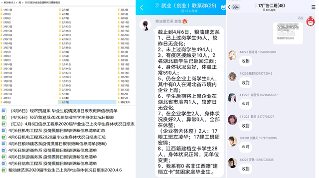 知己知彼,百战不殆。一是加强校企联动。疫情前,学院领导和专业系主任亲自带队,对意向企业走访调研,引进省内外342家用人单位来校参加校园招聘会;疫情防控期间,学院保持与合作企业的密切联系,保护学生顶岗实习权益、保障留岗休整实习生疫情防控安全,联合企业做好在岗学生安全稳定和人文关怀。二是建立工作台账。为掌握学生就业异动、就业需求和疫情期间学生身体情况,疫情发生后,学院毕业班辅导员通过微信、钉钉、电话等方式,一对一、全覆盖对毕业生进行摸底排查,根据学生就业意向建立2020届毕业生疫情防控台帐,填写2020届毕业生身体状况日报表和疫情期间就业摸排日报表,并要求台帐日日更新,日日通报,积极动态地了解和跟踪学生情况,根据企业用工需求和学生意愿,主动调整工作方法,做到就业工作有的放矢。