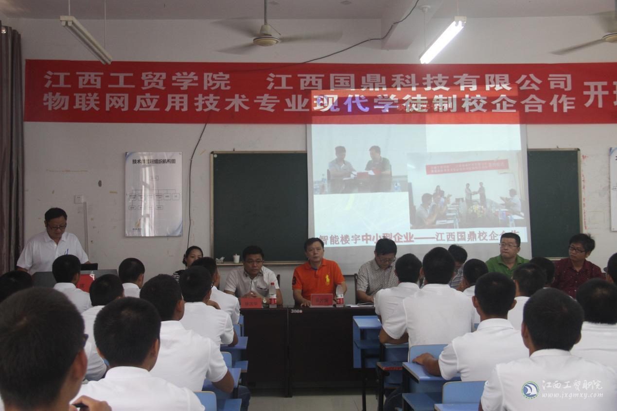 (信息工程系 傅菊春报道)9月19日上午,2016级物联网应用技术专业现代学徒制校企合作开班仪式在我院隆重举行,参加此次开班仪式的校方代表有:学院党委委员、调研员郝育忠,学院党委委员、院长助理艾苏龙,信息工程系领导及相关专业教师;企业方代表有:江西国鼎科技有限公司吴方国总经理,黄军勇副总经理,行政主管朱小红一行三人;2016级物联网应用技术专业全体同学及辅导员参加了开班仪式。开班仪式在第二专业楼110室举行,会议由信息工程系刘长万副主任(主持工作)主持。
