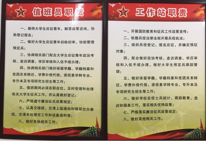 现场会按照征兵工作“十有”标准,对办公场所、标牌、国际互联网电脑、值班电话、政策汇编、工作职责和廉洁规定、值班记录本、初检初审设备、宣传公示栏等情况进行了统一规范。会上,邓丽钱老师对我院征兵工作规范化建设情况作了汇报,就征兵工作中所积累经验进行了交流。