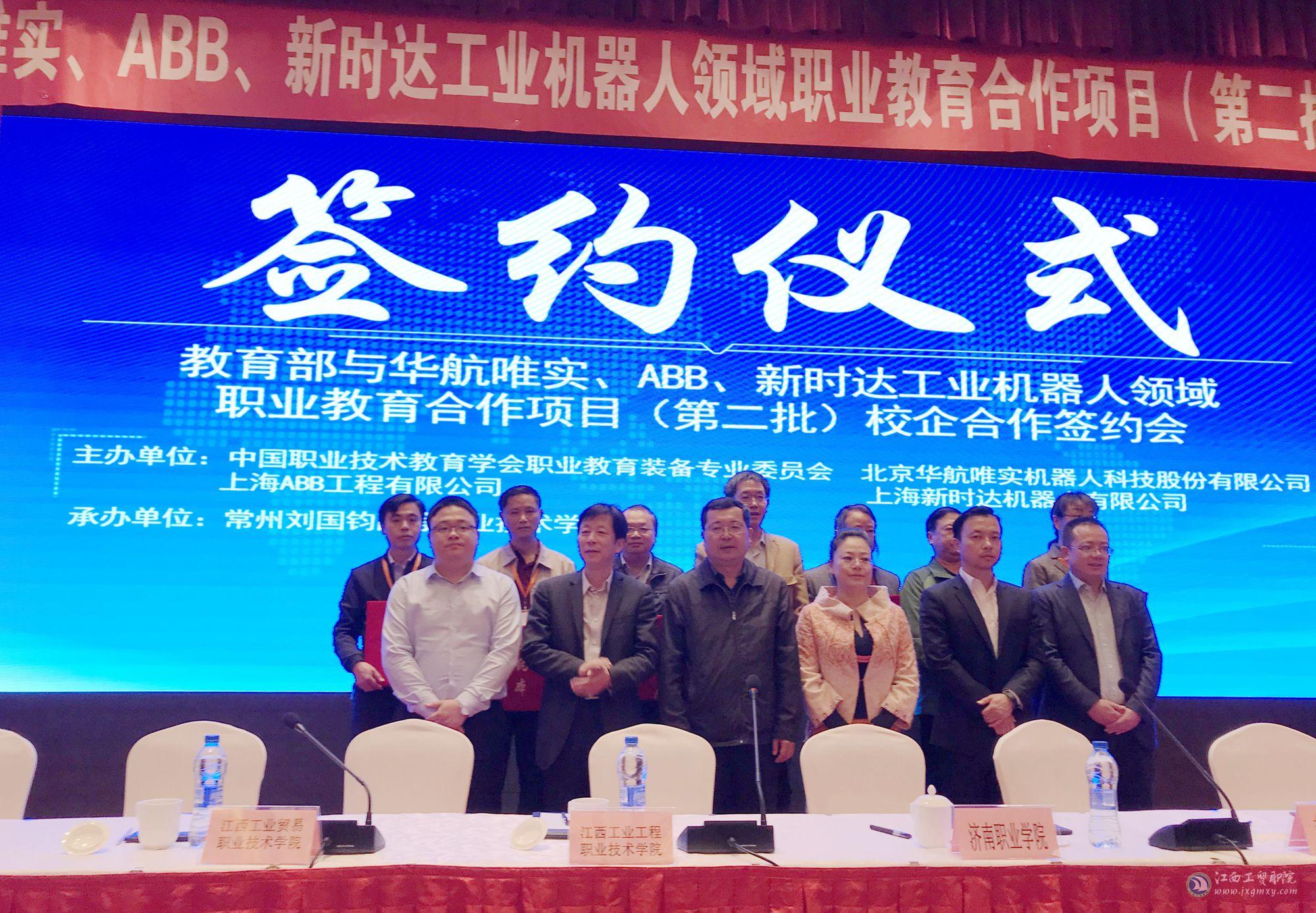 11月6日,教育部与华航唯实、ABB、新时达工业机器人领域职业教育合作项目(第二批)校企合作签约会在江苏省常州市锦江国际酒店隆重举行,来自全国各省市的38所职业技术学院参加了此次签约会。江西工业贸易职业技术学院党委委员、院长助理艾苏龙和机电工程系主任杜渊代表学院参加了签约仪式。