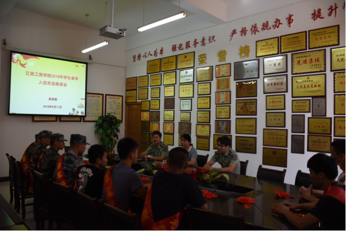 9月11日上午11时,江西工贸学院2018年学生参军入伍欢送座谈会在启航楼204会议室举行。学院党委委员、副院长赵淑华,武装部长李尊华出席欢送大会。会议由武装部副部长罗卫兵主持。