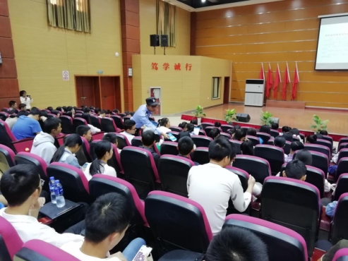 2018年10月29日,学院保卫处邀请红角洲派出所教导员胡寿生来校为同学们开展防盗防骗安全主题讲座,保卫处负责人邬啸峰主持,来自各系(部)的400余名同学认真聆听了讲座。