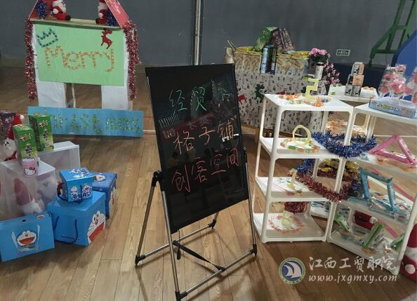 走进创客空间,就会让你眼前一亮。原本宽敞的地方,被隔成一个个小小的隔间。乍一看,就像是“蜂巢”。不过,走过一个个隔间,你就像在逛街,不同的格子间摆放着不同的商品,琳琅满目。格子铺里的零食造型有各种不同的形状,如“数字2016”、“立体几何形状”、以及独具创意的糖果“Merry Christmas”祝福语,体现了学生们的独特创新意识。为了营造圣诞气氛,现场还装扮了圣诞树,搭造了圣诞屋,还有许多圣诞老人玩偶。
