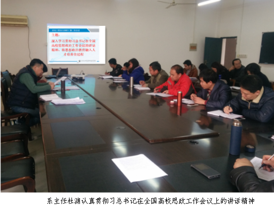 杜书记指出:我们要深入学习和深刻领会习总书记的讲话精神,要遵照学院党委书记、院长万玉青提出的“树立大思政概念、建立大思政体系”的要求,在学院党委领导下,在宣传部的统筹指挥和教务处、学工处的直接指导下,重点抓好师风师德教育工作,特别是要加强党政干部、党员教师、共青团干部、辅导员班主任等队伍的建设,全系所有课程要围绕学院思想政治工作的总体要求,与思政部的理论教育课程紧密配合、步调一致。同时,还对系部教师中存在的个别工作作风不实的现象进行了严厉地批评。