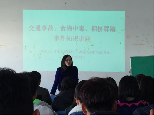 (旅游商务系 刘萍报道)为保障新学期开学的良好环境,进一步落实全国“两会”期间安全稳定工作会议精神,为做好旅游商务系安全稳定工作,坚决防止发生重大影响的政治案(事)件,坚决防止发生暴恐事件,坚决防止发生宗教极端暴力事件,坚决防止发生非法传教活动,坚决防止发生重大群体性事件,坚决防止发生个人极端事件,坚决防止发生大规模赴省进京集体上访,坚决防止发生公共安全事故,确保小问题能果断介入、妥善解决,确保大问题能迅速反应、及时处置,旅游商务系于2017年2月27日中午12:40在一专504召开了关于交通事故、食物中毒、拥挤踩踏事件知识讲座,主讲人是旅游商务系副主任、系党支部副书记万颖同志,系综治信息员刘萍、专职辅导员吴剑锋、刘璐老师以及全系学生会干部参加了此次讲座。