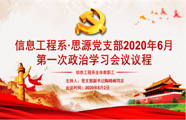 为了推进新时代文明实践所·信息工程系思源党支部,认真学习贯彻全国“两会”精神,进一步增强教职工“四个意识”,坚定“四个自信”,激励全体教职工不忘初心、牢记使命、尽职尽责,信息工程系思源党支部全体教职工于2020年6月2日下午14:30在思泽楼315会议室,以线上+线下的形式,开展六月份第一次政治学习。会议由党支部副书记陶晓峰同志主持,系部全体教职工参加学习。
