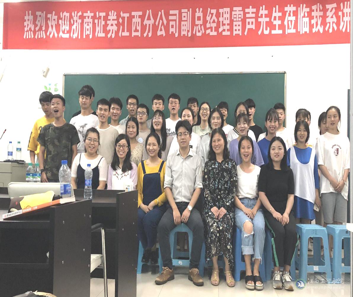 为推动金融管理专业素养教育,提高人才培养质量,增强学生在经济发展新常态下对投资环境、投资特点和创新投资产品的理解和认识,2018年5月16日星期三晚19:00至21:00在芳泽楼405教室,经济贸易系邀请浙商证券江西分公司副总经理雷声来我系开展金融产品大类分析与设计浅析专题讲座。经济贸易系财会教研室主任胡越君、会计专业教师袁三梅、徐薇鸿、袁慧以及17级金融管理班的学生到场聆听讲座。