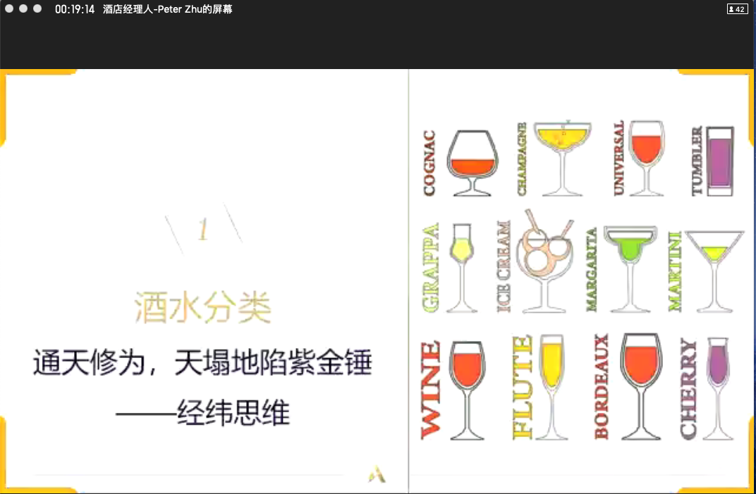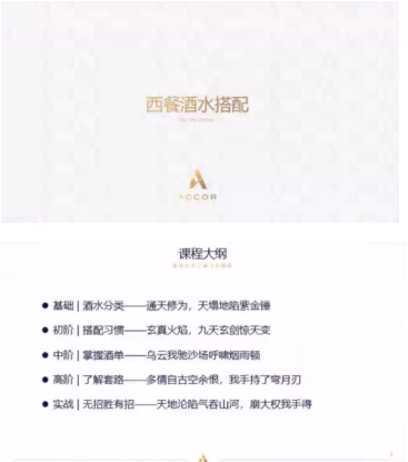 开课后,老师进行简短的自我介绍后步入正题,结合当下的热点,用一种非常新颖的方式介绍课程的内容,分阶段、分级别的进行课程的教学,围绕《西餐基本服务实务》课程进行西餐酒水搭配知识的教学分享,主要介绍了酒水分类、搭配习惯、酒单认知、实践服务等专业知识。