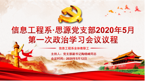 为了推进新时代文明实践所.信息工程系思源党支部深入学习领会习近平新时代中国特色社会主义思想精神,信息工程系全体教职工于2020年5月12日下午14:30在“钉钉”APP上开展5月份第一次政治学习。会议由党支部副书记陶晓峰同志主持,系部全体教职工参加学习。