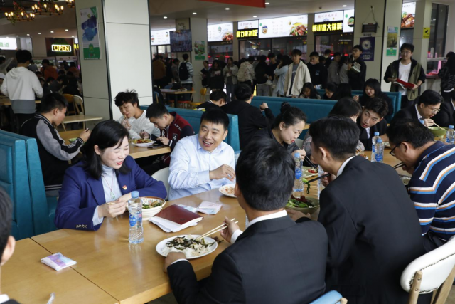 11月19日中午,宋小兵与同学们一起在食堂三楼就餐交谈,听取同学们对食堂服务的意见和建议,他鼓励同学们就建设优质就餐环境、提升服务质量等方面多提合理性、可行性建议。同学们对食堂饭菜价格、口味、品类和服务质量等方面均表示满意。