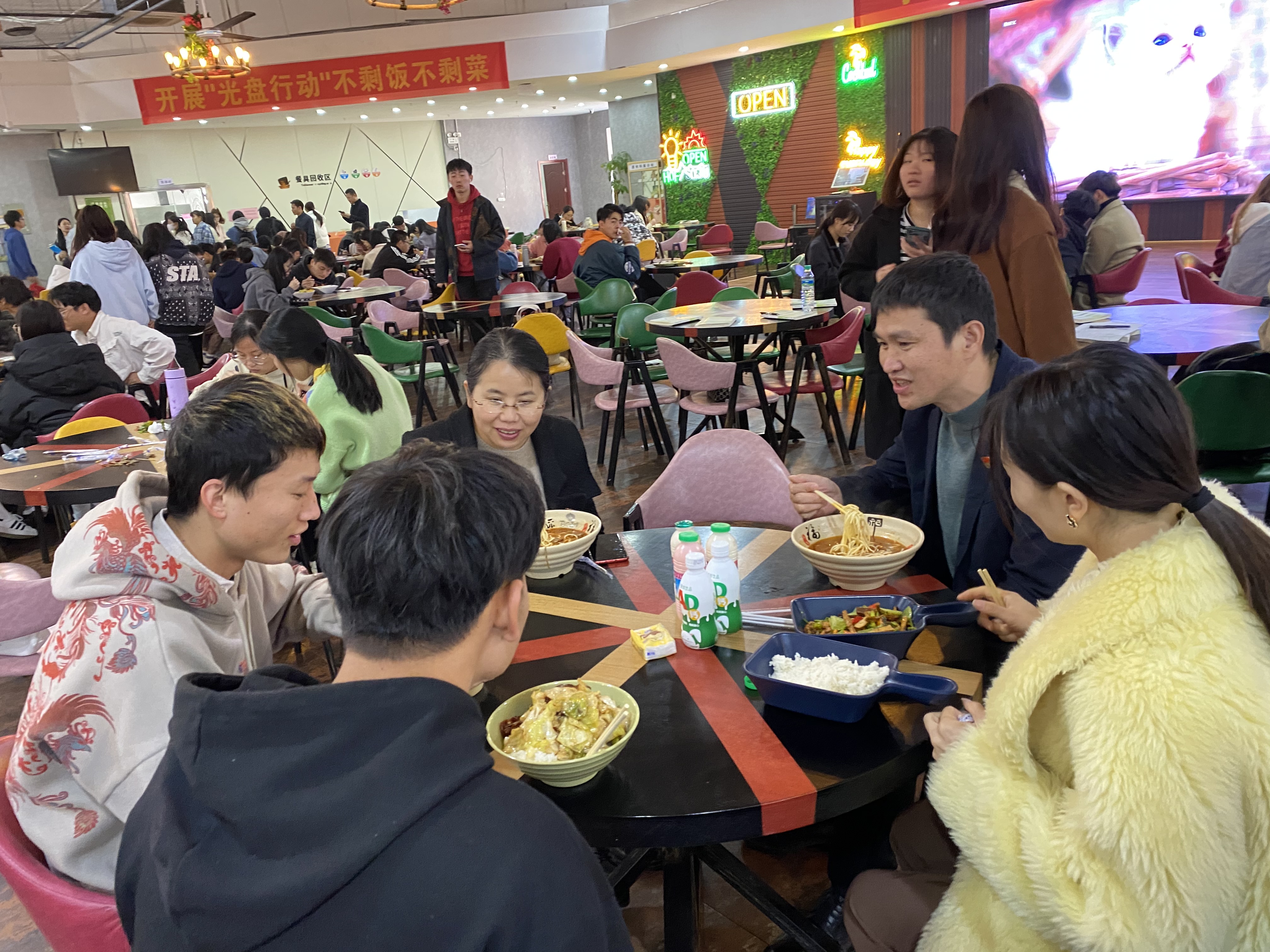 时间一晃到了午餐时间,12点30的食堂三楼,已经陆陆续续来了很多就餐学生,赵淑华和同学们一起排队打饭。就餐期间,她与同学们就学院饮食、学习和生活中遇到的困难、平时兴趣爱好、家庭情况、未来规划等话题展开交流,并给予他们以指导。时间一点一点地流逝,整个午餐时光欢乐而温馨......