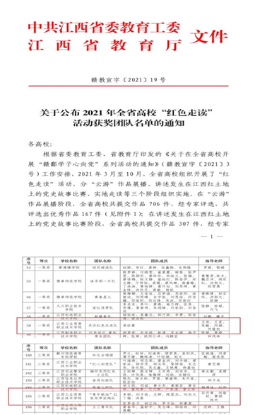 近日,由江西省委教育工委、省教育厅组织的2021年全省高校“红色走读”活动评选结果揭晓。学院选送的寻访红色足迹队《让青春在党旗下闪耀》,“青年粮站”红色筑梦实践队《绘就百年路奋进新征程——100幅手绘作品献礼建党百年》两件作品分获实地走读成果一等奖和三等奖。