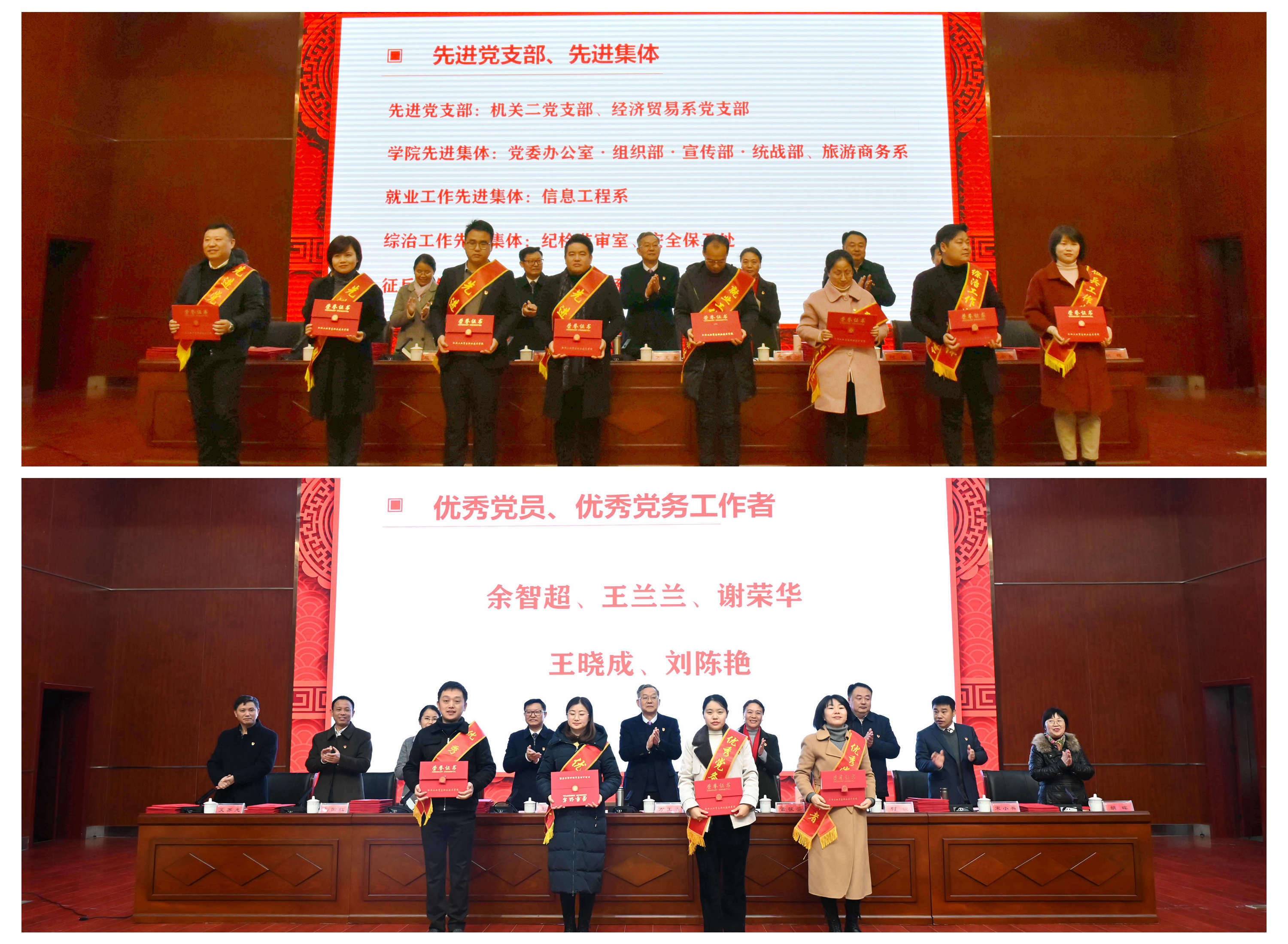 会上,何锐宣读《中共江西工业贸易职业技术学院委员会关于表彰2021年度先进党支部、优秀党员及优秀党务工作者的决定》;赵淑华宣读《江西工业贸易职业技术学院关于表彰2021年度先进集体及先进工作者的决定》;宋小兵宣读《江西工业贸易职业技术学院关于表彰2021年度科研工作先进个人的决定》;刘国红宣读《江西工业贸易职业技术学院关于表彰2021年度综治工作先进集体及先进个人的决定》;胡晖宣读《江西工业贸易职业技术学院关于表彰2021年度征兵工作先进集体及先进个人的决定》;艾苏龙宣读《江西工业贸易职业技术学院关于表彰2021年度就业工作先进集体及先进个人的决定》。