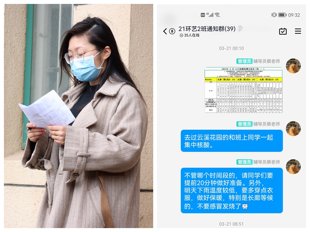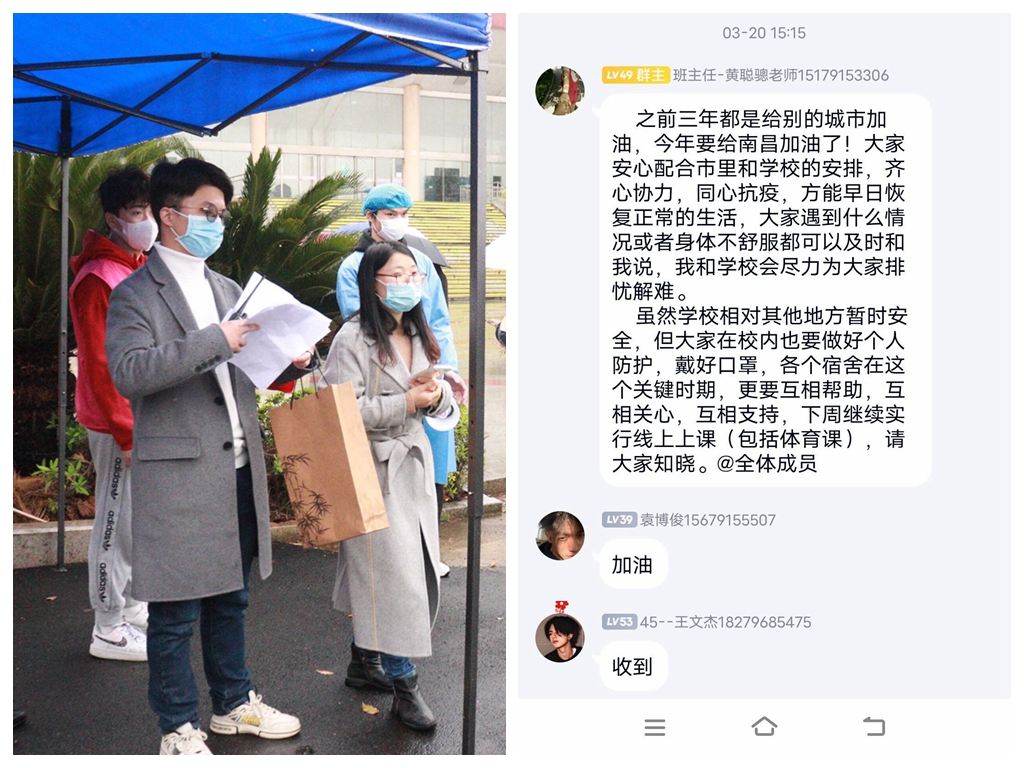 “同学们,打赢疫情防控阻击战,一日三测需坚持,口罩一戴,万毒莫侵;七步洗手,病魔无招。”“今天我们班上午10点在体育馆做核酸检测,请大家提前准备好昌通码,有序排队。”旅游商务系辅导员黄聪骢在收到学院校园管控通知时,他立马从家里赶往学院参与到抗疫一线工作中,甚至连生活用品都没有来得及收拾,从3月17日起一直在校守护学生平安,用真诚的陪伴、真心的守护,为同学们送上了春寒料峭里温柔的暖意。