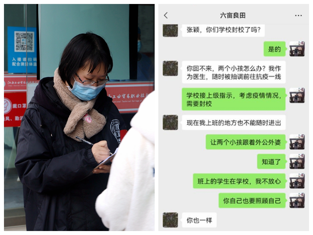 “3月22日,雨天。爱人奋战抗疫一线,纵使心中有万般不舍,6岁的儿子和2岁半的女儿只能交给家人照顾,作为一名辅导员老师,我有责任有义务在这个时候守护在学生的身边。工作责任重大、任务艰巨、使命光荣,‘想学生之所想,忧学生之所忧,急学生之所急’,用爱和责任为学生保驾护航。”——主动请缨,第一时间返校参与疫情防控的经济贸易系辅导员张颖。