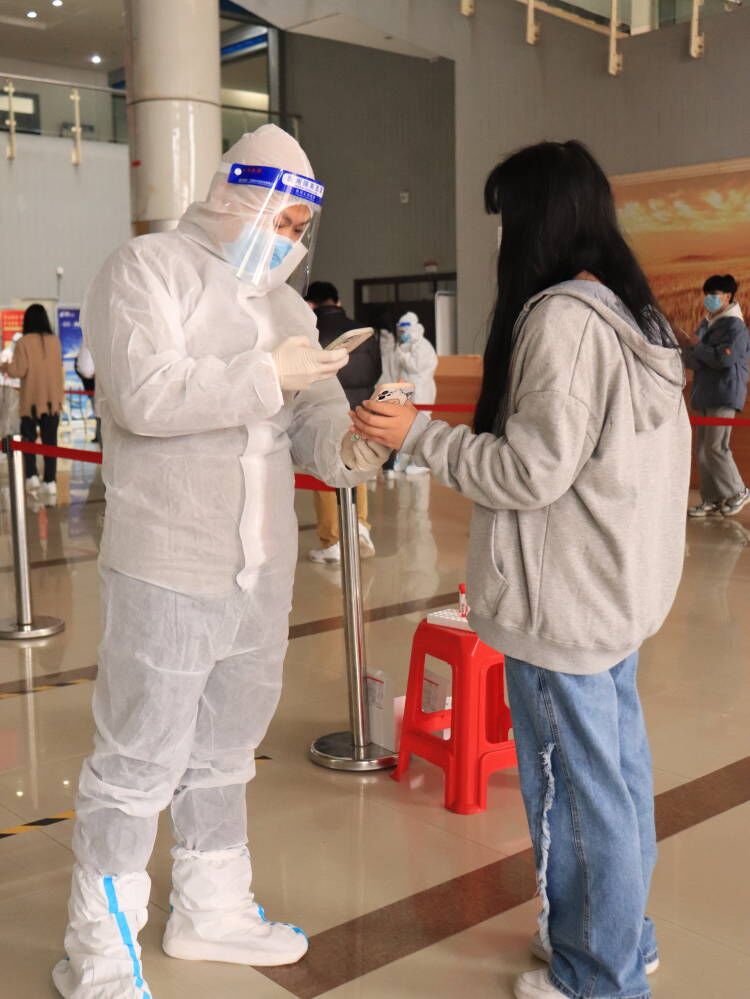 “3月23日,阴天。当医护人员结束核酸检测工作时,同学们为全体医护人员送上亲手制作的手工艺品,感谢全体医护人员。一次次核酸检测,是一次次的心手相牵、是一次次的大爱无言。现场的我流泪了,感谢有你。”——刚结束核酸检测扫码记录、维持秩序工作的旅游商务系辅导员宋振语。