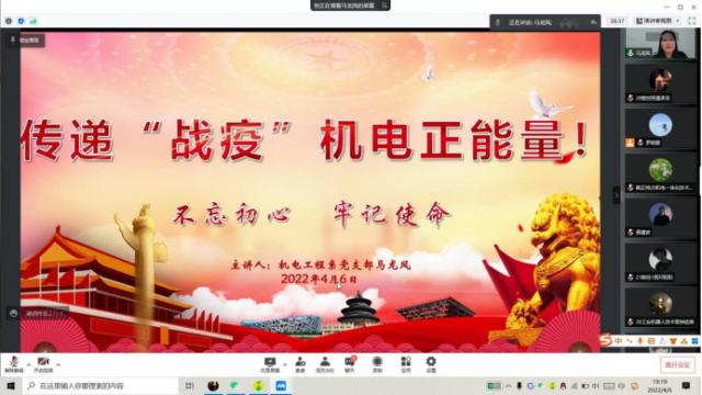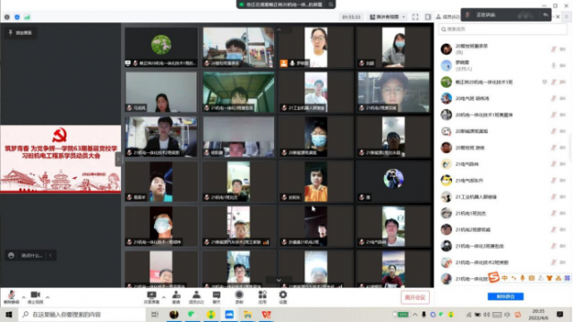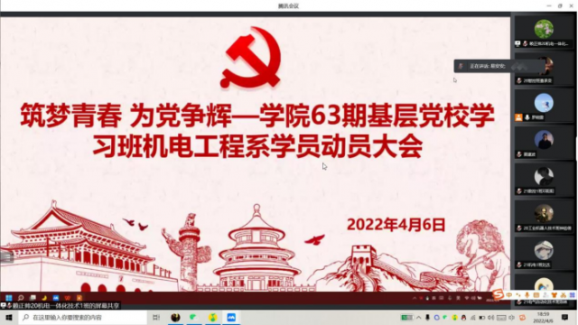 根据学院基层党校第63期学习班工作安排,4月2日晚,机电工程系光明党支部以线上的形式召开系部学员动员大会,系党支部书记马龙凤、副书记刘颖出席,组织员、团总支书记、辅导员代表、基层党校63期学习班机电工程系全体学员参加会议。
