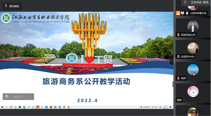 为了让系部教师更加了解江西省教师教学能力竞赛的内容和规则,帮助今年的参赛队伍更科学地进行备赛,营造“比学赶超”的系部教学工作氛围。2022年4月12日14:20旅游商务系2021年省赛一等奖队伍——轨道交通客运服务团队负责人黄聪骢老师在线上进行了省赛经验的分享活动。旅游商务系主任谢恺、副主任韩莹、黄婧及全体教师参加了会议。