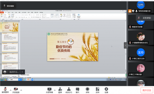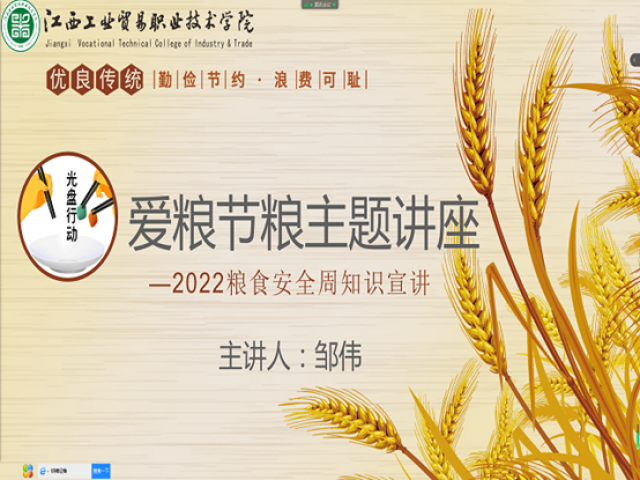 为深入贯彻落实习近平总书记关于粮食安全的重要讲话精神,学习贯彻总体国家安全观和国家粮食安全战略,推动国家安全宣传教育深入开展。2022年4月18日,粮油食品系结合疫情防控要求,面向系21级全体学生线上开展了“爱粮节粮”粮食安全主题讲座,主讲人为邹伟老师。