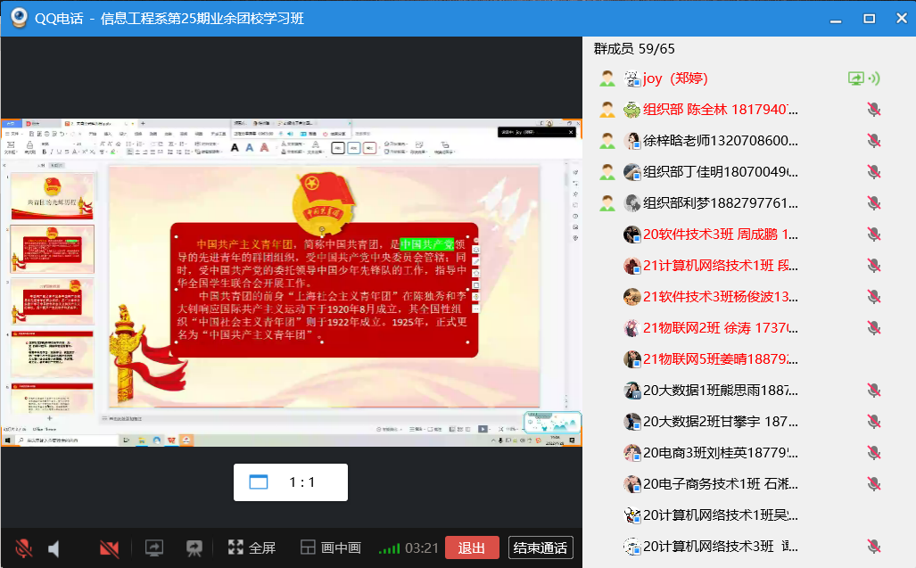 在为期多天的课程中,信息工程系团总支书记李冉老师、辅导员郑婷老师为入团积极分子们详细讲解“共青团的性质与任务”、“共青团的组织制度”、“共青团的光辉历程”、“入团第一课”的主题团课。老师们的细心讲解都在告诉学员们作为时代新青年的担当与作为,并分享了自己在实际工作中的经验与心得,为同学们带来了一堂堂精彩的团课。