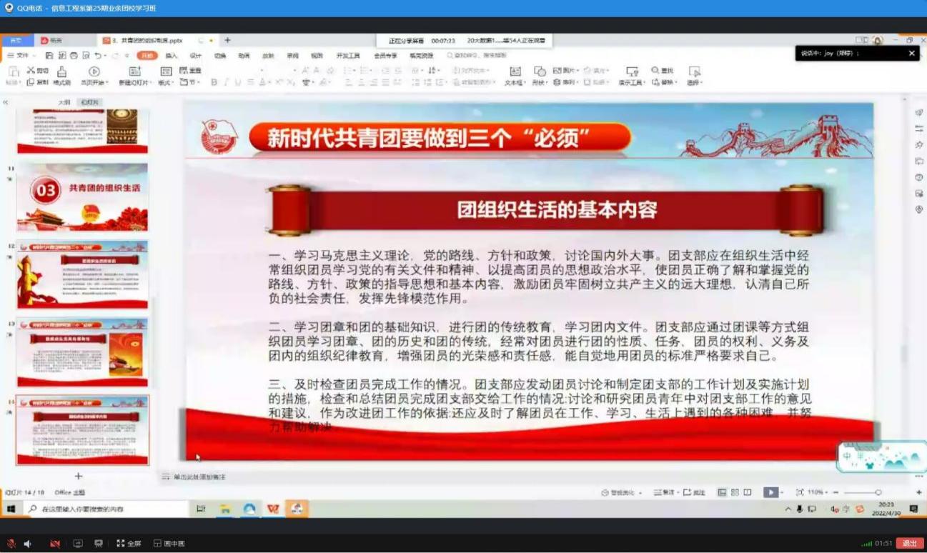 2022年是中国共产主义青年团成立100周年,更是党的二十大召开之年。为持续深入推进全面从严治团,不断提高团组织凝聚力、向心力、号召力,进一步加强新时代团员队伍建设,江西工业贸易职业技术学院信息工程系第二十五期业余团校于4月26日正式开班,为期22天,通过8学时团课学习、志愿服务活动、结业考试等环节,最终从57名入团积极分子中选出13名同学推优入团。