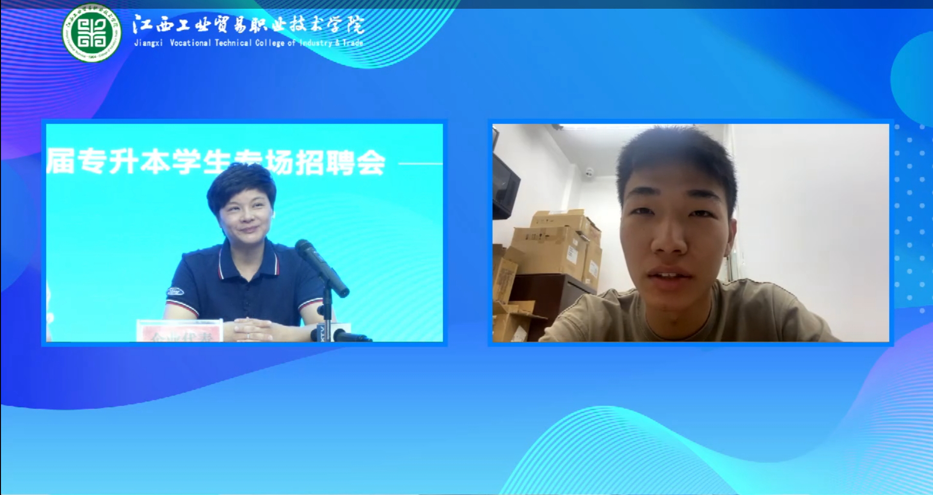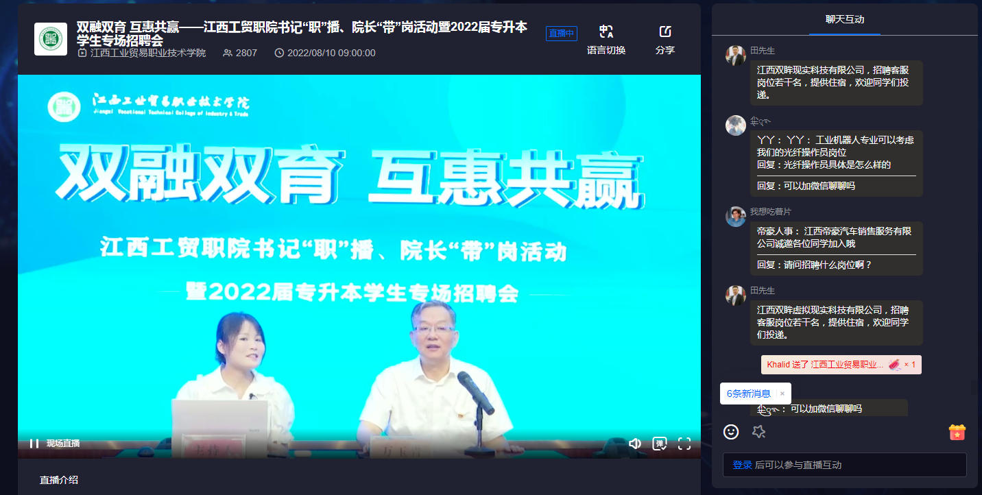 在全国上下喜迎党的二十大召开之际,全省高校组织开展“双融双育”活动时,8月10日,江西工业贸易职业技术学院举行“双融双育互惠共赢”书记“职”播、院长“带”岗活动暨2022届专升本学生专场招聘会,学院党委书记万玉青,党委副书记、院长雷筱芬走进直播间,带头为学生“代言”,当起毕业生“推介员”,开启就业推介新模式。学院党委委员、院长助理艾苏龙,学院办公室、党委办公室、就业创业学院、各系部负责人,企业代表、毕业生通过线上线下参加专场招聘会直播活动。本次专场招聘会邀请62家企业,共计1200余个岗位参与招聘。