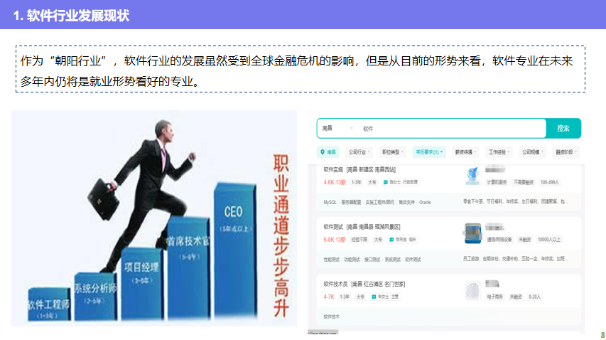 在讲解软件行业发展现状的过程中,曲正老师强调,软件行业依然是当下互联网、通信领域中岗位最多、需求最大、就业最广的一个就业方向,其中包括技术类岗位和非技术类岗位,行业也划分为多种领域,例如金融、通信、民生、工业等。在谈到各领域的软件发展时,曲正老师列举了周边真实发生的项目案例,结合当前市场的发展趋势,阐述了软件技术发展的必然趋势。