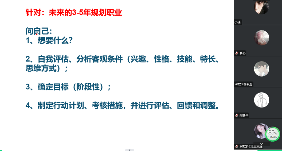 其后,曲正老师在就业自我定位方面给同学们进行了指导,告诉同学们在就业过程中,需要充分做好就业规划,清楚当下自己想要什么、如何开展自我评估、如何确定目标、如何制定计划。