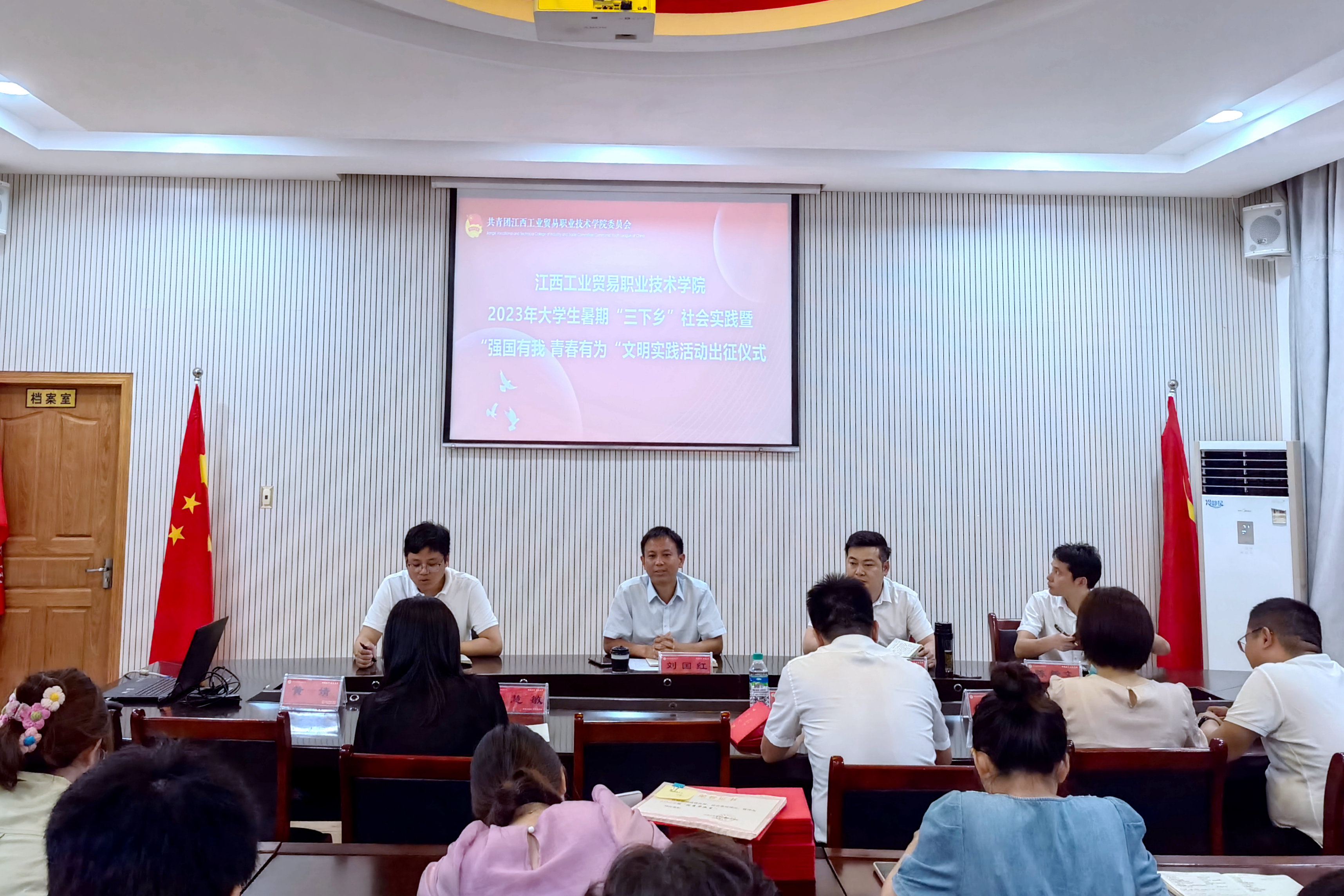 6月27日下午,学院举行2023年大学生暑期“三下乡”社会实践暨“强国有我青春有为”文明实践活动出征仪式。学院党委委员、副院长刘国红出席仪式并为实践队授旗,学生工作处部门负责人,各系分管学生工作副主任、团总支书记、学管员及学生代表参加出征仪式。仪式由院团委书记熊彬主持。