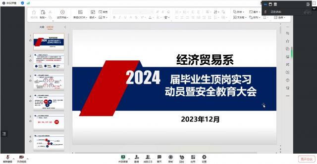 为推动经济贸易系2024届毕业生顶岗实习及就业工作顺利开展,加强学生校外实习期间的安全管理,帮助学生快速适应角色转换,确保圆满完成实习任务,经济贸易系于2023年12月27日晚召开2024届毕业生顶岗实习动员暨安全教育大会。本次会议由经济贸易系分管就业副主任何静主持,2024届毕业生(含本科生)、毕业班辅导员参加会议。
