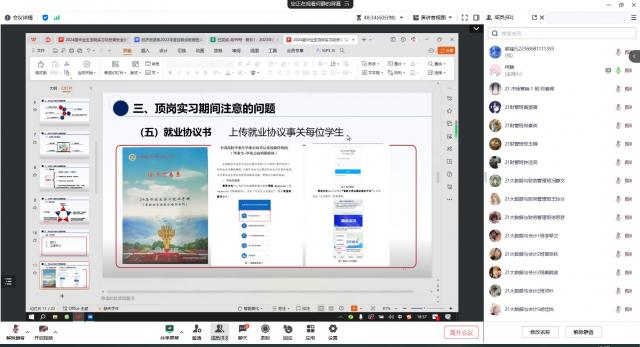 何静从正确认识顶岗实习、学会转变角色和观念、熟悉全国高校毕业生就业去向登记系统操作和防范实习期间各类安全事故几个方面进行讲述。会议中,何静主任强调了三点要求,第一要认真对待实习,实习是一门课程,是必修课,实习好才能为未来就业做好铺垫,实现实习就业一体化。第二征兵、专升本为高质量就业,应届毕业生需要认真思考,做好各方平衡。第三在实习岗位上要注意生产安全、交通安全、消防安全、人身和财产安全,时刻保持清晰头脑。