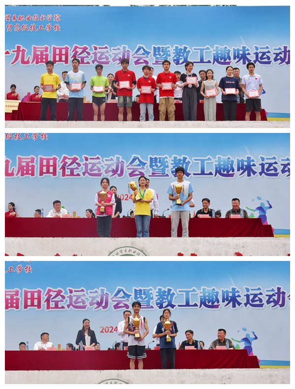 闭幕式上,何锐宣布本届运动会优秀运动员获奖名单,曾聪宣布本届运动会的系部组织奖获奖单位、破纪录项目与团体总分获奖系部(班级),主席台与会领导为获奖集体和个人颁奖。经过三天激烈角逐,机电工程系、信息工程系、旅游商务系荣获优秀组织奖;经济贸易系李孛,机电工程系温轩铭,信息工程系陈浩、贺文胜、陈有龙、危宇杰,旅游商务系邱梓月,社会体育系严雅楠、尹薰、李建国等10名同学荣获优秀运动员称号,信息工程系、粮油·建艺系、机电工程系荣获甲组团体总分前三名,经济贸易系、旅游商务系、机电工程系荣获乙组团体总分前三名,2022级社会体育3班、2022级社会体育1班荣获丙组团体总分前两名。本届运动会共打破纪录8项24次。