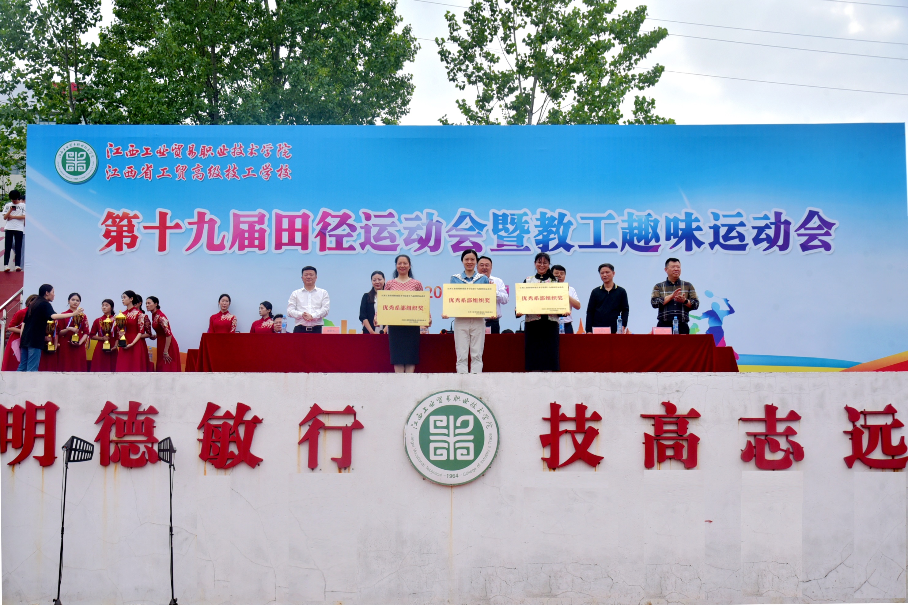 4月26日下午,江西工业贸易职业技术学院第十九届田径运动会暨教工趣味运动会闭幕式在田径场举行。学院党委委员、纪委书记何锐,党委委员、副院长宋小兵、曾聪,党委委员、院长助理艾苏龙,党委委员、党委宣传部部长谢继勇,院长助理王佳出席闭幕式,各相关部门负责同志及师生代表参加闭幕式。