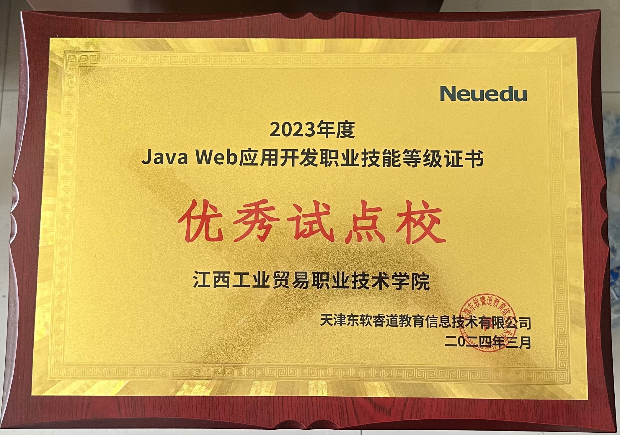 为贯彻落实《关于在院校实施“学历证书+若干职业技能等级证书”制度试点方案》等相关文件精神,江西工业贸易职业技术学院圆满完成2023年度1+XJavaWeb应用开发职业技能等级证书试点和考核工作,被授予“2023年度JavaWeb应用开发职业技能等级证书优秀试点校”称号,学院周斯昱、饶瑞芳两位老师被评为JavaWeb应用开发职业技能等级证书2023年度优秀考评员。