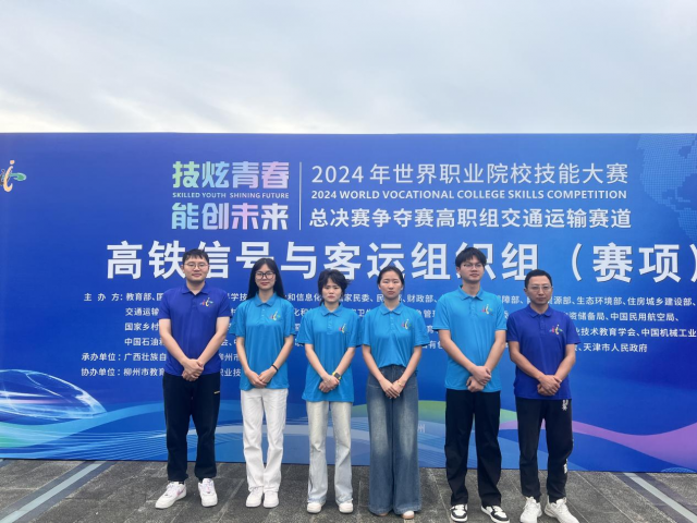 技炫青春,能创未来。10月27日至10月30日,2024年世界职业院校技能大赛总决赛争夺赛“高铁信号与客运组织(高职组)”赛项在柳州铁道职业技术学院顺利举行。来自全国30个省、自治区、直辖市的52支队伍共208名选手齐聚柳州,同台竞技。由我系黄聪骢、张洪照老师指导,黄昊老师领队,城市轨道交通运营管理专业学生王雅婷、江宜萍、许艳敏、王康平四位同学组成的代表队,经过激烈角逐,凭借卓越的专业素养和出色的表现,荣获全国铜奖。