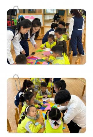 随后,进入了“认识图形”的智慧时光。七巧板作为一种古老而经典的智力游戏,能够很好地锻炼孩子的空间想象力和逻辑思维能力。学前教育专业的学生们巧妙地设计了互动游戏,如“快速拼图挑战”“故事讲述”等,让孩子们在动手拼接的过程中,逐渐掌握了图形的基本构造和拼搭技巧。孩子们的想象力和创造力在这一片片小小的图形中得到了充分释放,一幅幅独特的图案在他们手中诞生,激发了他们对艺术创作的热爱。