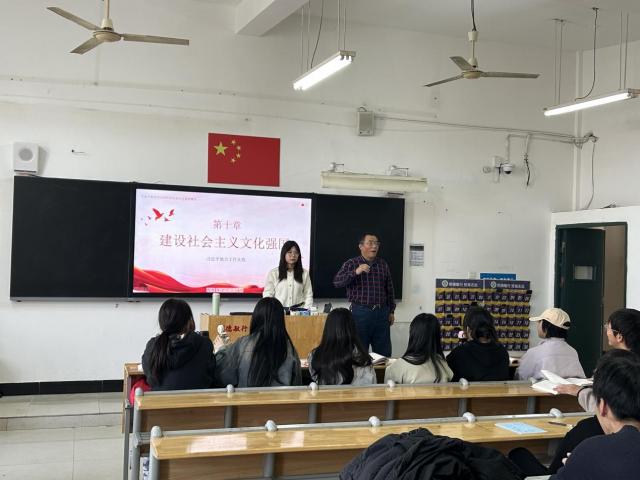 为深入学习贯彻党的二十届三中全会精神和全国教育大会精神,加快推进江西省“大思政课”综合改革试验区建设,持续探索“双师同堂”教学模式,持续深化学院思政课教学改革,提高思政课教学质量,切实提升“习近平新时代中国特色社会主义思想概论”课程教学效果和学习效果,2024年12月4日,我校思政部王晓歌老师诚挚邀请南昌航空大学马克思主义学院刘宣如教授及教改团队在志学楼406教室,共同为24级联合培养本科物联网工程4班的学生们带来了一堂精心设计、双师联动的高质量思政课。