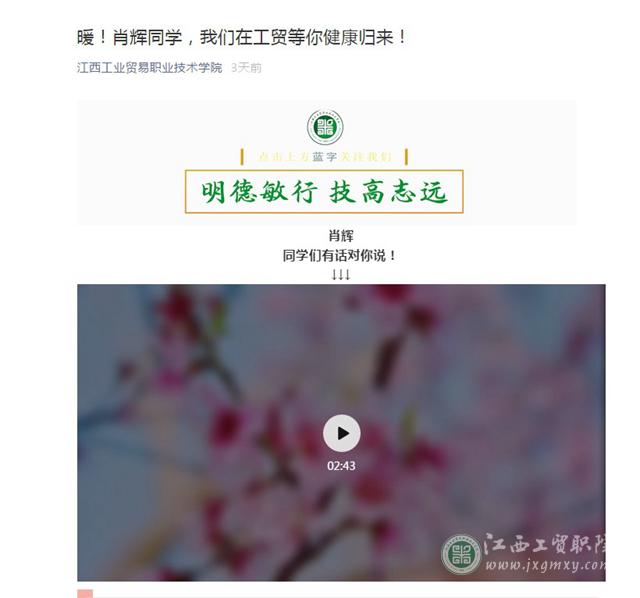 肖辉同学的病情深深地牵挂着师生们的心,为了表达对肖辉的思念和祝愿,大家将自己想对肖辉说的话录制并剪辑成了一段温情而又充满力量的视频,传给了远在上海重症监护室的他。很多师生也在学院官方微信进行留言,祝愿肖辉同学早日康复,一位同学留言说:“肖辉同学你好,虽然我们不是一个班的也相互不认识,但是我们是属于工贸的一份子我们也是同学,在这里祝你早日战胜病魔,我期待着和你在学校相遇认识的一天,加油!”