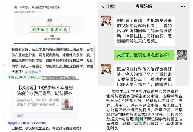 面对治疗急需的巨额医疗费,肖辉家人倍感焦急。辅导员李冉老师第一时间将学生情况汇报给学院,学院立即启动特困生帮扶机制,学院领导带头捐款并通过学院、系部官微以及水滴筹动员师生进行爱心捐献。