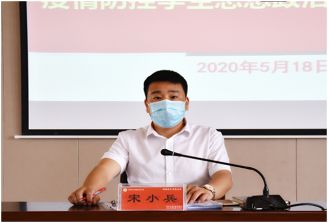 宋小兵在会上讲话,他强调面对新冠肺炎疫情这场“大战”“大考”“大课”,我们学工战线的全体同志要扛起肩上重任,主动担当作为,不折不扣贯彻落实好上级和学院疫情防控办的各项工作要求,将疫情防控工作作为首要政治任务,抓紧抓实抓细、严防严控严管。并就做好学院学生开学返校疫情防控和学生安全稳定工作作三点要求:一是提高认识,主动掌握当前疫情防控形势;二是精准施策,做实做细疫情防控工作;三是坚持不懈,始终抓好学生安全稳定工作。