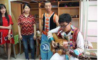 今年的新生中还有畲族与回族的同学,他们特意穿上了自己家乡独有的民族服饰,欢迎院领导的到来,并且展示了自己的才艺。他们边弹吉他边唱歌,用自己民族特有的方式对领导的慰问表示感谢。