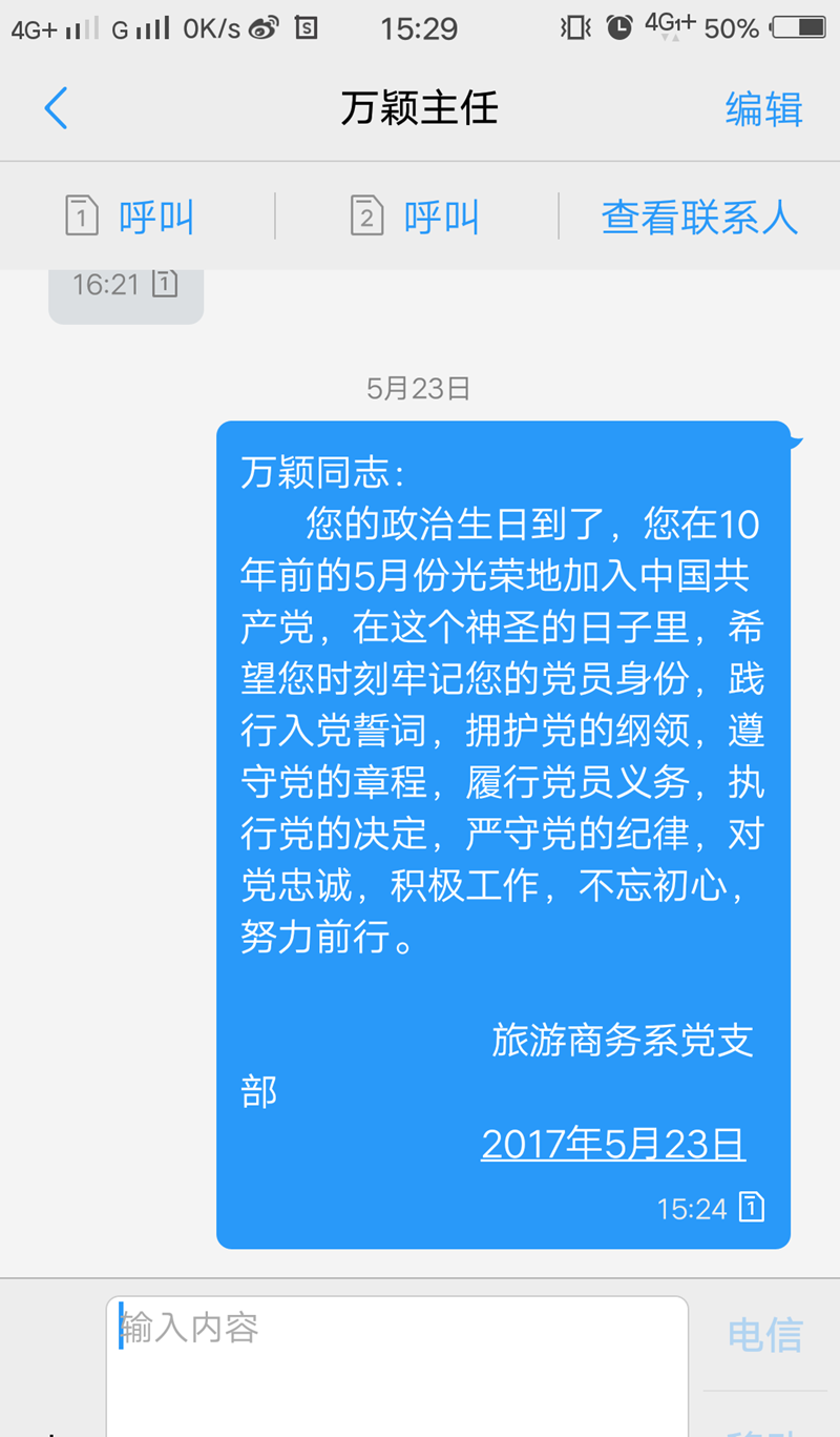 “您的政治生日到了,您在多年前的今天光荣的加入中国共产党,在这个神圣的日子里,希望您时刻牢记自己是一名共产党员,践行入党誓词,严守党的纪律,在自己的工作岗位上积极做好本职工作,做好学生思想政治教育的引路人.....”每位党员在入党的那一天收到了组织发来的短信。