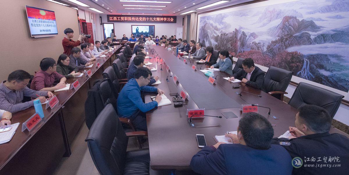 10月27日晚,江西工业贸易职业技术学院召开专题会议,第一时间传达学习党的十九大精神,会议强调,要把学习宣传贯彻党的十九大精神作为学院首要政治任务,以习近平新时代中国特色社会主义思想武装头脑、统一思想、指导实践,迅速在全院兴起学习党的十九大精神热潮,并将精神积极贯彻到学院各项工作中。