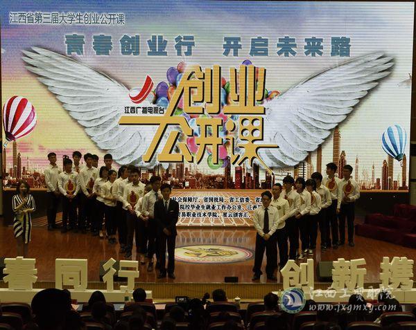 江西广播电视台综合新闻频率总监罗春瑜、江西省高等院校毕业生就业指导服务中心副主任舒正鸣和创业科科长安光、江西省就业局创业中心主任张新瑾、江西工贸职院院长雷筱芬、副院长赵淑华及500名校内外师生现场观看了此次公开课。