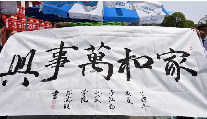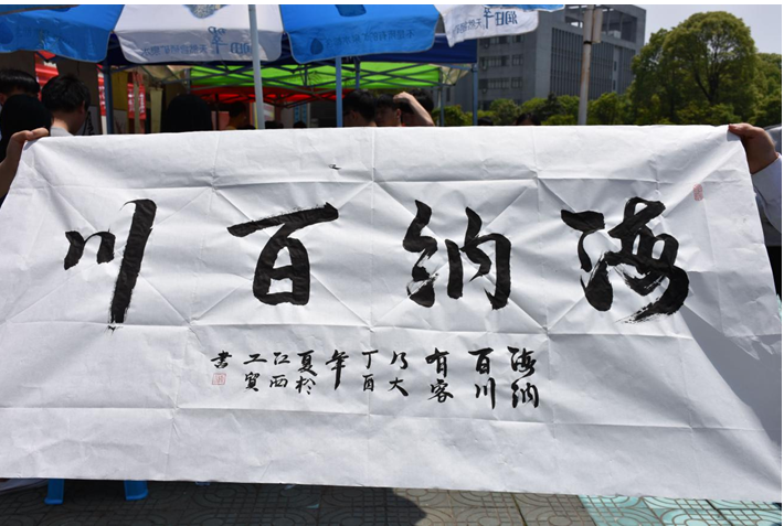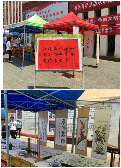4月24日中午12点30分,第十二届“红五月”文化艺术节-“弘扬五四精神,抒写热血青春”书法比赛在食堂门口顺利开展。