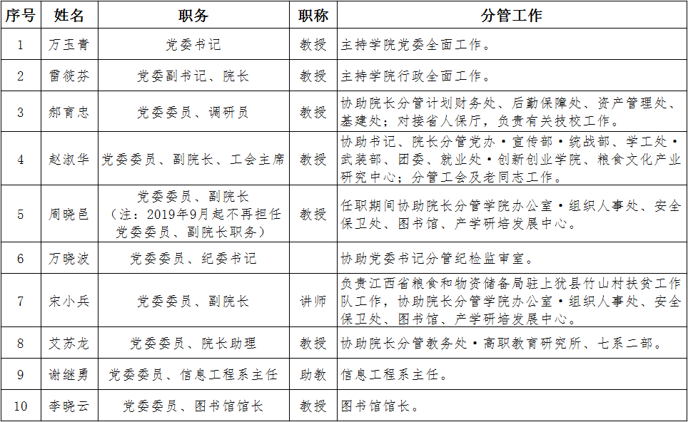 学院领导组成及分工情况一览表(2019年1-10月)