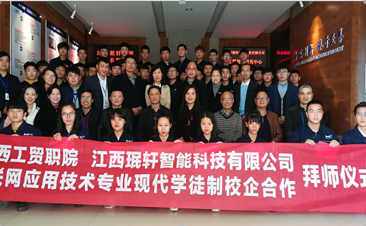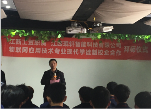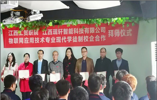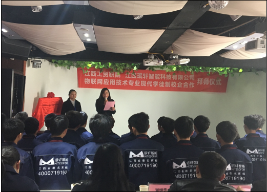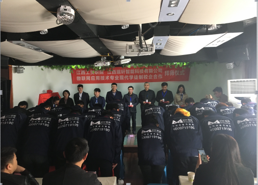 阳春三月、万物复苏,江西工贸职院物联网现代学徒制“珉轩班”拜师仪式于3月23日下午在江西珉轩智能科技有限公司多功能厅隆重举行,江西工贸职院党委委员、院长助理艾苏龙教授、党委委员、信息工程系主任谢继勇、副主任马龙凤、夏昕,江西珉轩智能科技有限公司董事长李淑琴女士、总工程师肖勇先生、薛勇强先生以及2017级物联网现代学徒制“珉轩班”校企双方师傅、全体学生出席。