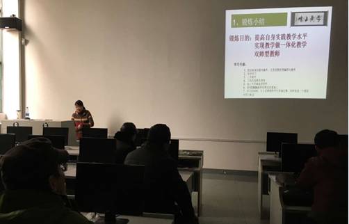 验收汇报分三个部分进行,第一部分是胡素萍教师的自我总结,第二部分是胡素萍教师进行理论与操作相结合的示范教学,第三部分是各评委对于胡素萍教师挂职锻炼期间的表现的评议。